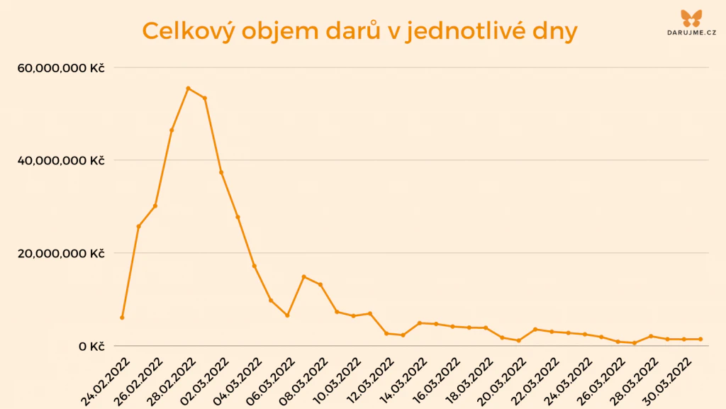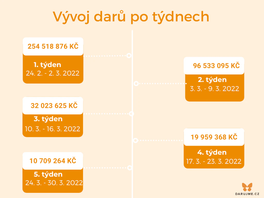 Rekordní nebyl jen počet otevřených sbírek, ale i rychlost s jakou zareagovali dárci. Hned první den invaze věnovali do sbírek přes 6 mil. Kč, o den později už 25 mil. Kč, rekordní pak byl