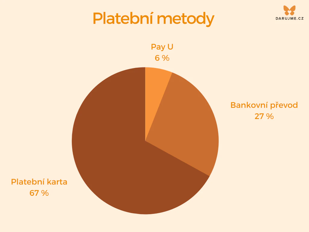 Při platbě 67 % dárců využilo platební kartu (včetně metod GooglePay a ApplePay), 27 % poslalo dar bankovním převodem.