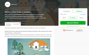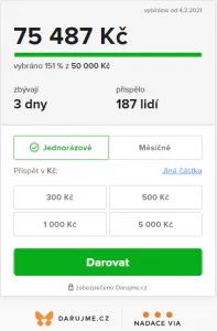 Součástí projektu je darovací widget, díky němuž dárci mohou vidět, kolik se už vybralo prostředků, kolik zbývá vybrat do cílové částky, a kdy byl projekt založený. K projektu může být připojena také dárcovská výzva některého z vašich nadšených ambasadorů.