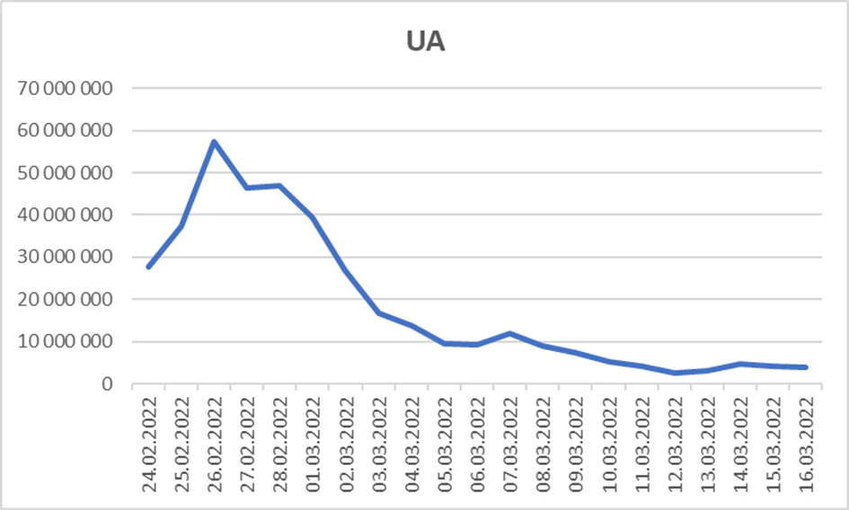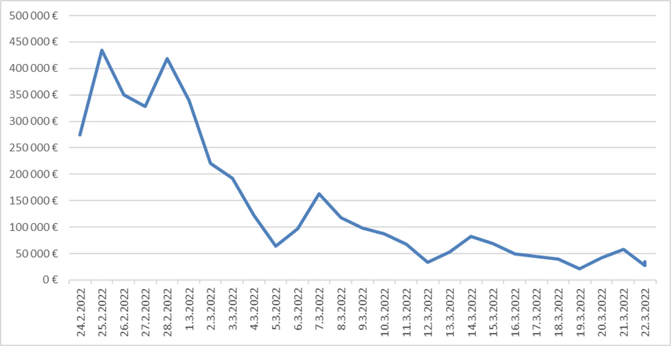 Tento graf prezentuje zaslané dary - pomoc pro Ukrajinu na kampaně přes Darujme.cz v prvním měsíci. Zcela jasně demonstruje, že první 3 dny jsou klíčové. Stejně tak tomu bylo i v případě darování na Slovensku skrze kampaně a sbírky na Darujme.sk.