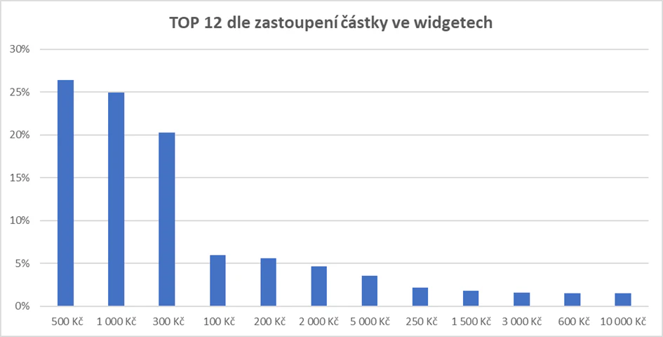 České organizace mají nejčastěji nastavené částky 500 Kč, 1000 Kč a následně 300 Kč. Darovací tlačítko s výší daru 10 000 Kč je zastoupené spíše minoritně a pohybuje se hluboko pod 5% hranicí zastoupení…