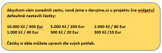 Obdobnou zkušenost mají také na Darujme.sk a kdybychom tak měli dát (ne)vyžádanou radu pro fundraisery, určitě doporučujeme zvážit do Vašeho widgetu zařadit možnost daru v již zmiňované částce 10 000 Kč, ale také 2 000 Kč a 5 000 Kč. Je to příležitost, která se vyplatí.