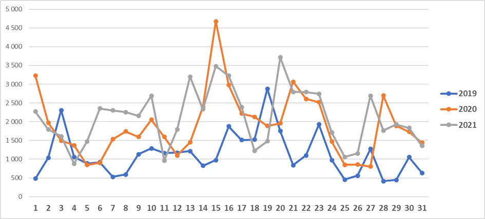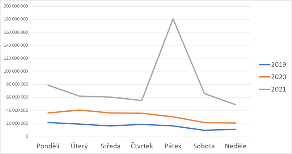 Fundraiser může být tvorem líným, ale pozor, pouze v sobotu! Na otázku, kdy lidé v průběhu týdne darují nejvíce je tak jednoduchá odpověď: kdykoliv, ale nejméně v sobotu. A to jak v české, tak slovenské kotlině. Níže naleznete graf darování napříč týdnem a poznámka pod čarou: nedivte se prosím pátečnímu „výkyvu“ v roce 2021. Čtvrtek 24.6. ve večerních hodinách totiž moravské obce zasáhlo tornádo a data uplynulého roku jsou tak samozřejmě významně ovlivněna touto skutečností.