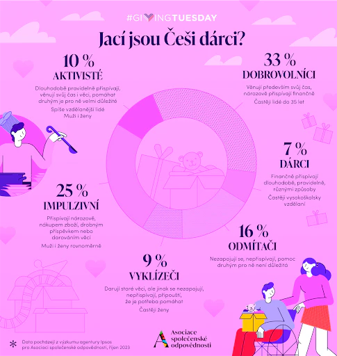 Nejnovější celorepublikový výzkum agentury Ipsos pro Asociaci společenské odpovědnosti rozdělil Čechy na pět kategorií podle jejich ochoty pomáhat a darovat. Třetina Čechů věnuje především svůj čas v dobrovolnických aktivitách, 25 procent patří mezi Impulzivní – přispívají nárazově. Pro 16 procent obyvatel není dobročinnost téma a nijak se nezapojují.