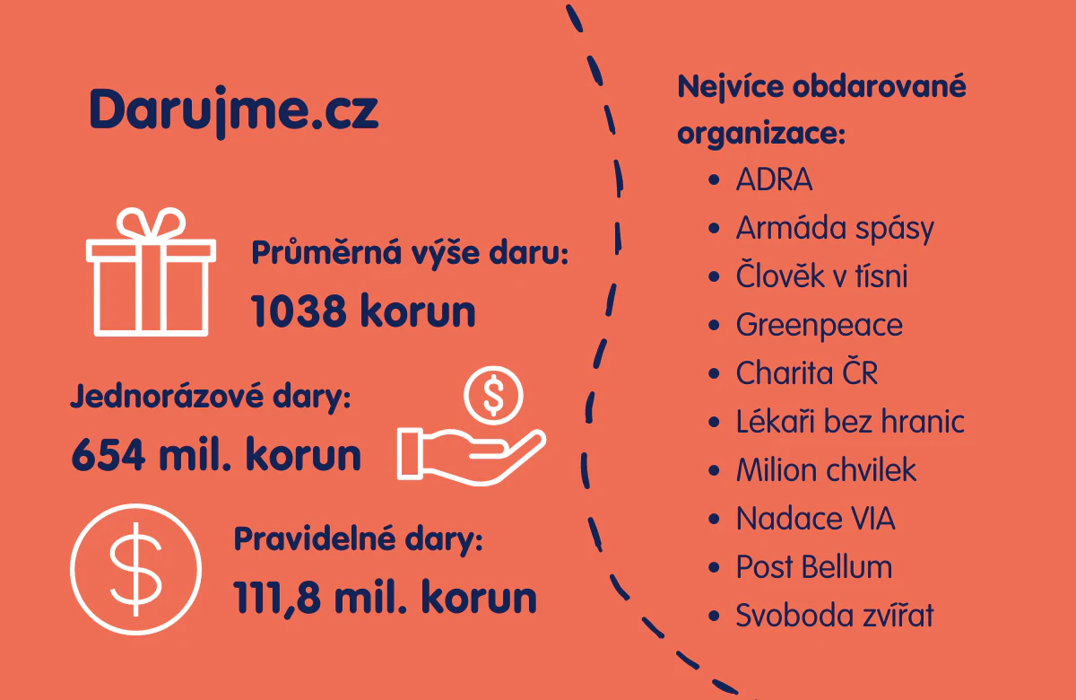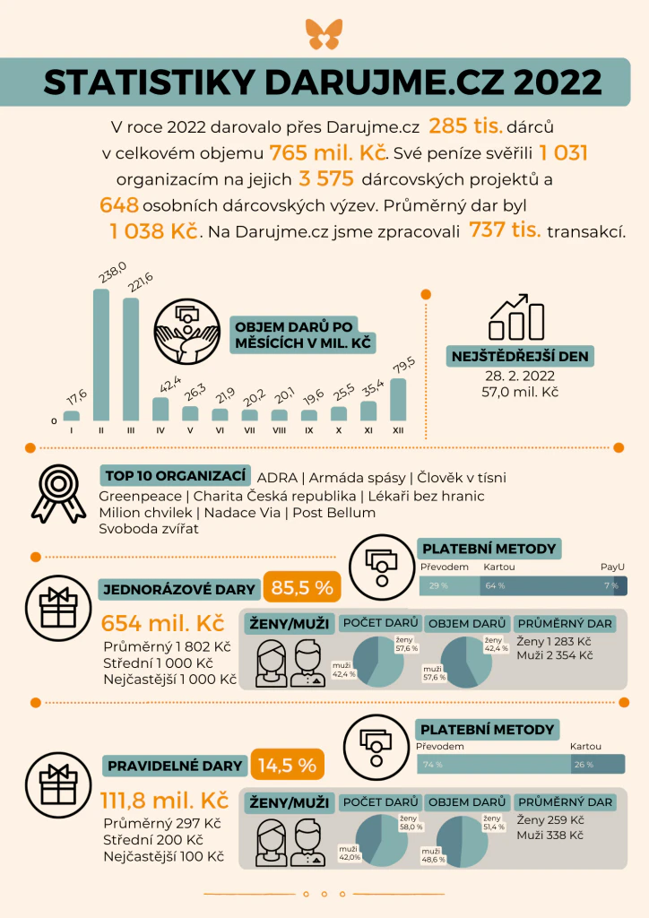 Více než 765 milionů korun poslali lidé v roce 2022 na dobročinné účely přes portál Darujme.cz. Celkem 285 tisíc dárců (z toho téměř třetina byli prvodárci) podpořilo činnost 1031 organizací, spolků a obcí. Platforma pro online fundraising provozovaná Nadací Via opět překonala svůj rekord – loňská částka převyšuje tu z předešlého roku o 36 procent. 85 procent tvořily jednorázové dary, nejčastěji dárci přispívali částkou 1000 korun. Průměrná darovaná jednorázová částka vyrostla na 1802 korun, u pravidelných dárců na 297 korun.