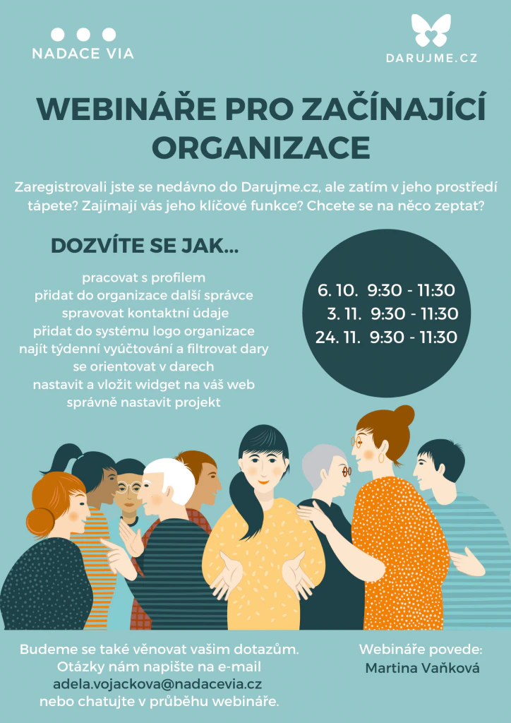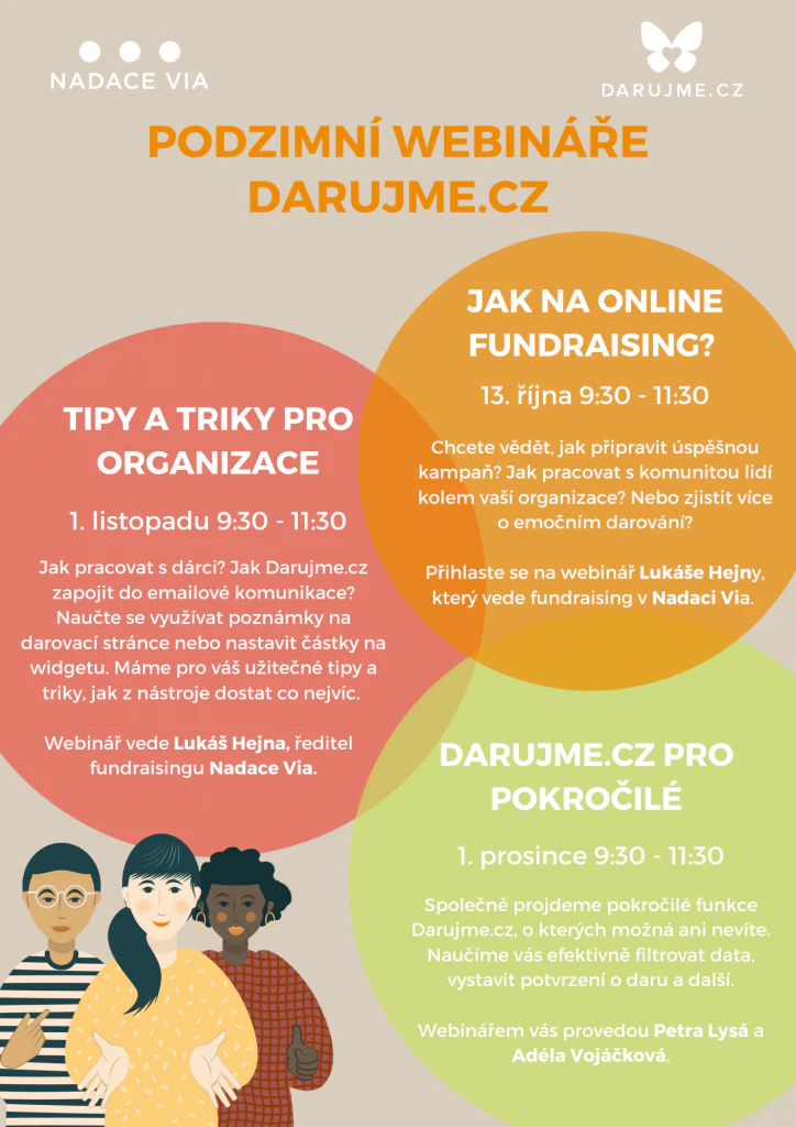 Jak na online fundraising? 13.10. 9:30 - 11:30Tipy a triky pro organizace? 1.11. 9:30 - 11:30Darujme.cz pro pokročilé 1.12. 9:30 - 11:30 (webinář je z důvodu nemoci přeložen na 12. ledna 2022)
