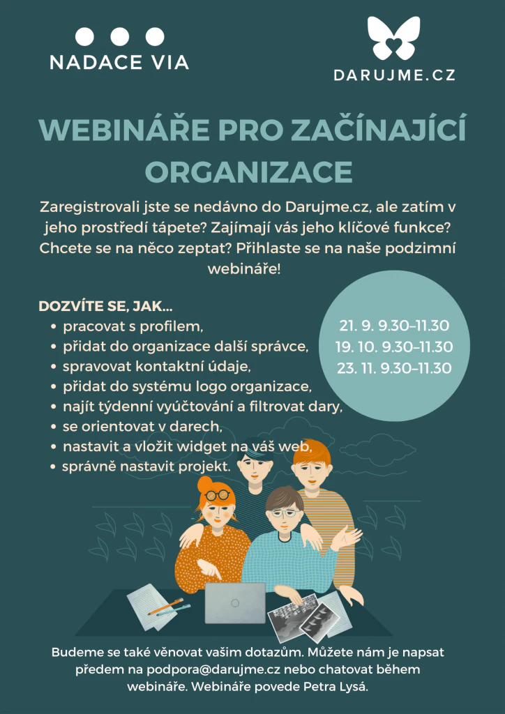 Podzim a zima budou na Darujme.cz opět ve znamení vzdělávání. Připravili jsme pro vás 5 webinářů, které jsou určené začátečníkům, pokročilým uživatelům, ale také všem, kteří se chtějí dozvědět více o fundraisingu. Doufáme, že pro vás webináře budou přínosem a oceníme vaši zpětnou vazbu. Přihlásit se na ně můžete zcela zdarma. Těšíme se na vás!