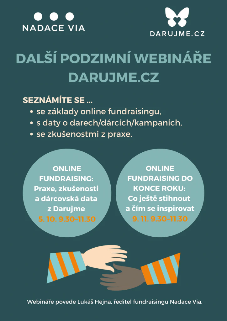Online fundraising: praxe, zkušenosti a dárcovská data z Darujme pro vaše úspěšné kampaně: Středa 5. 10. (9:30 – 11:30)Online fundraising do konce roku: co je možné ještě stihnout a čím se inspirovat: Středa 9. 11. (9:30 – 11:30)