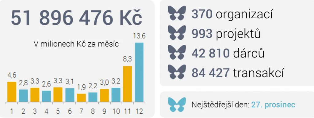 Tenhle odstavec nebude žádné překvapení - nejštědřejším měsícem byl tradičně prosinec (s dary v hodnotě 13,6 milionu Kč) a nejštědřejším dnem 27. prosince.