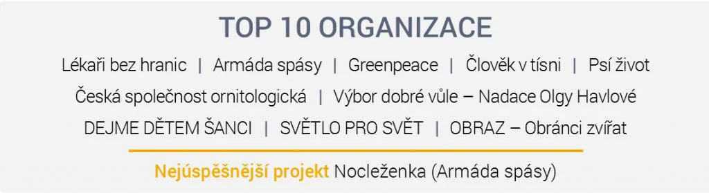 Nárůst jsme zaznamenali i u počtu obdarovaných organizací. Oproti 266 organizacím v předchozím roce se letos z přízně dárců mohlo těšit již 370 organizací. Podpořeno bylo 993 jednotlivých projektů z širokého spektra činností od humanitární pomoci, přes protikorupční aktivity, až po ochranu životního prostředí. V kategorii nejúspěšnější projekt pak s přehledem zvítězila Nocleženka Armády spásy. Mezi nejoblíbenější organizace co do počtu darů se řadí Lékaři bez hranic, Armáda spásy, Greenpeace, Člověk v tísni, Psí život, Česká společnost ornitologická, Výbor dobré vůle – Nadace Olgy Havlové, DEJME DĚTEM ŠANCI, SVĚTLO PRO SVĚT a OBRAZ – Obránci zvířat.