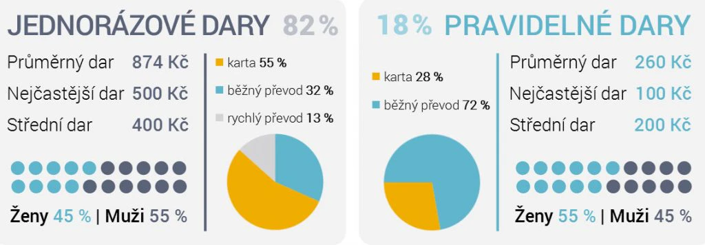 Jednorázové dary vychází z porovnání s pravidelnými dary jednoznačně lépe. Konkrétní skóre je 82 % pro jednorázové na 18 % pravidelných. Jednorázové dary posílají častěji muži, zatímco ženy darují častěji pravidelně.