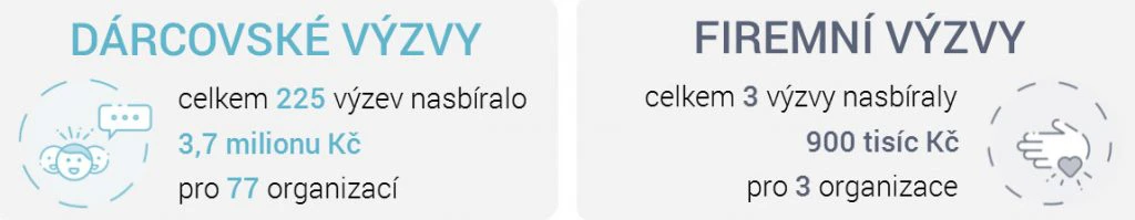 Rok 2017 bychom v Darujme.cz mohli bez váhání překřtít na rok dárcovských výzev. Jejich bilance je následující. Loni se do výzvy pustilo 225 ambasadorů, kteří svými běhy, výšlapy a oslavami vybrali přes 3 miliony korun. Výzvy nejsou určeny pouze pro jednotlivce, ale taky pro firmy. Možnosti uspořádat firemní výzvu využily od podzimního spuštění modulu 3 firmy. Částka, která se jejich pomocí vybrala, se vyšplhala na 937 tisíc Kč. Fenomén „peer2peer fundraisingu“ se v ČR snažíme šířit, a z výsledků loňského roku tak máme velkou radost.