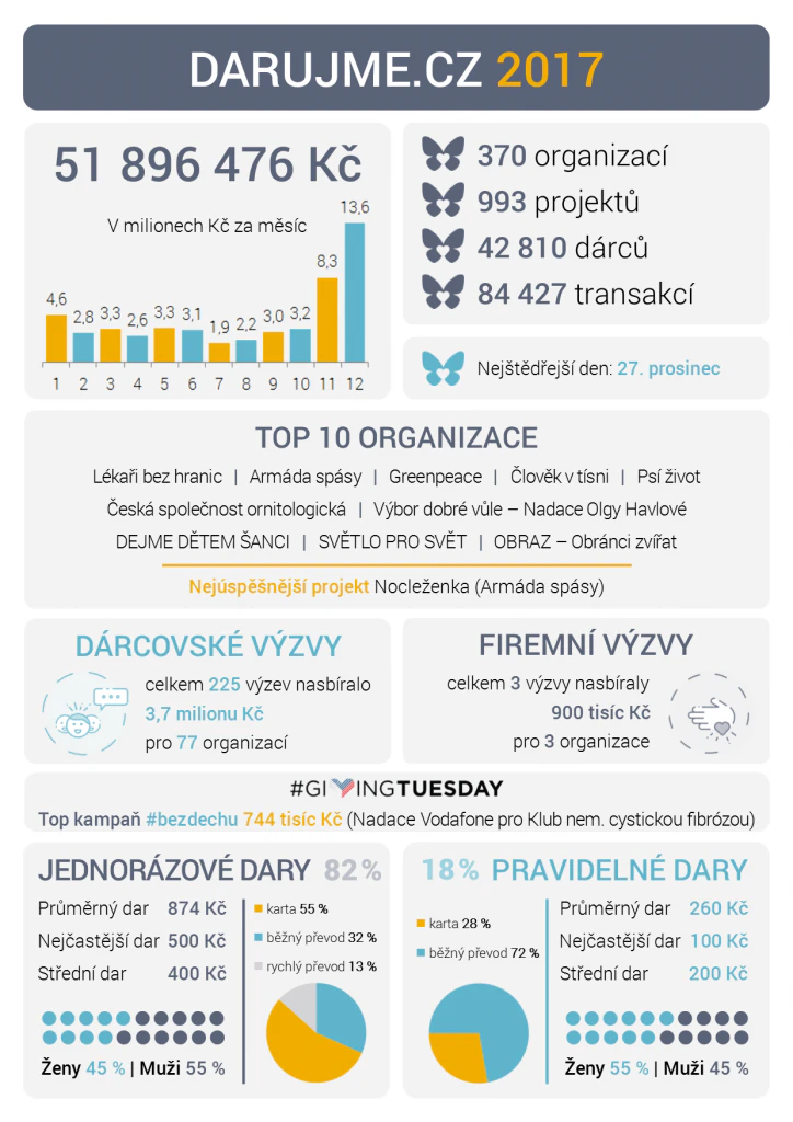 Zatímco se snažíte dostát svým předsevzetím a hledíte vstříc lepší budoucnosti, kde se z vás stanou pohlední štíhlí nekuřáci, zn. s chalupou, my v Darujme.cz se vracíme hluboko do minulosti. Do loňského roku. Rok 2017 byl pro Darujme.cz opravdu přelomový. Na jeho začátku jsme spustili nový systém se spoustou praktických funkcionalit, který měl zásadní vliv na výsledné statistiky darování přes Darujme.cz. Jak jsme upozorňovali v minulém článku, dárcovství obecně roste a ani dárcovství pomocí Darujme.cz se rozhodně nenechává zahanbit. Připravili jsme pro vás proto přehled dat a čísel, kterých byl v roce 2017 náš portál svědkem.