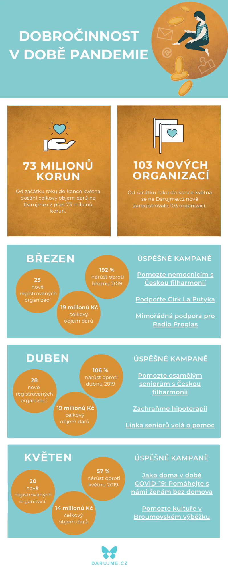 Od začátku roku do konce května dosáhl celkový objem darů na Darujme.cz přes 73 milionů Kč a nově se registrovalo 103 organizací (březen - květen celkem 73 nových organizací).