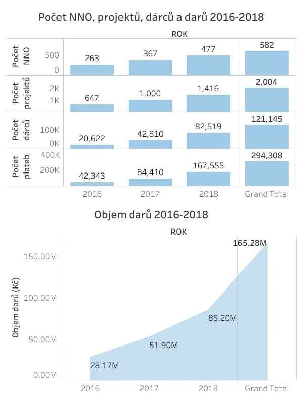 Všechny veličiny a jejich vývoj v čase zobrazuje následující graf. Z něj je patrné, že počet organizací i projektů roste meziročně o 1/3. Počet dárců i darů se každý rok zdvojnásobí. Objem darů se zvyšuje pomalejším tempem, a sice o 84% mezi roky 2016–17 a o 64% mezi roky 2017–18. Důvodem je klesající průměrná výše daru (zejména darů jednorázových).