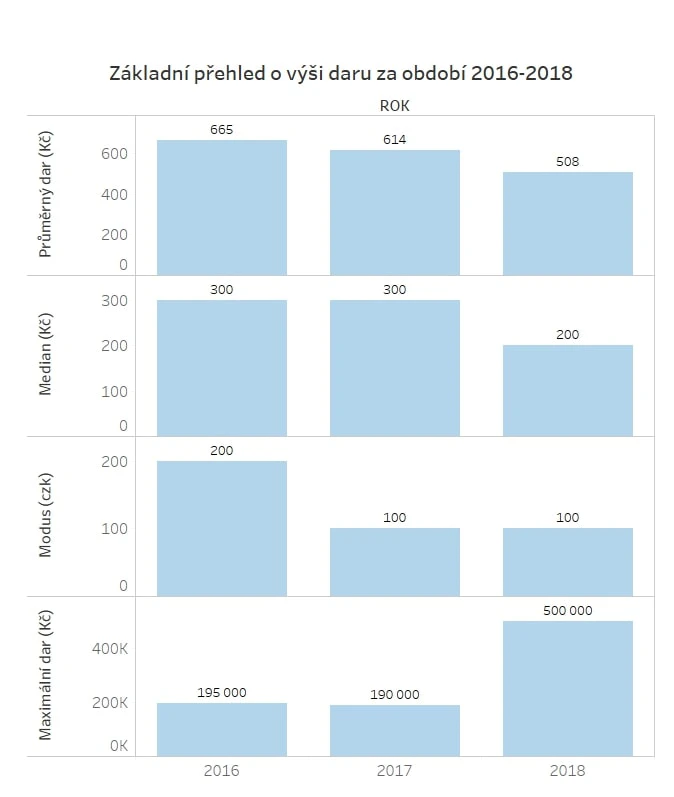 Pro přesnější vykreslení průměrné hodnoty daru uvádíme medián (200 Kč v roce 2018) a modus (100 Kč v roce 2018), jelikož můžeme vidět, že průměrný dar je ovlivněn maximálními dary (500 000 Kč v roce 2018). Většina darů (80%) má hodnotu do 500 Kč.
