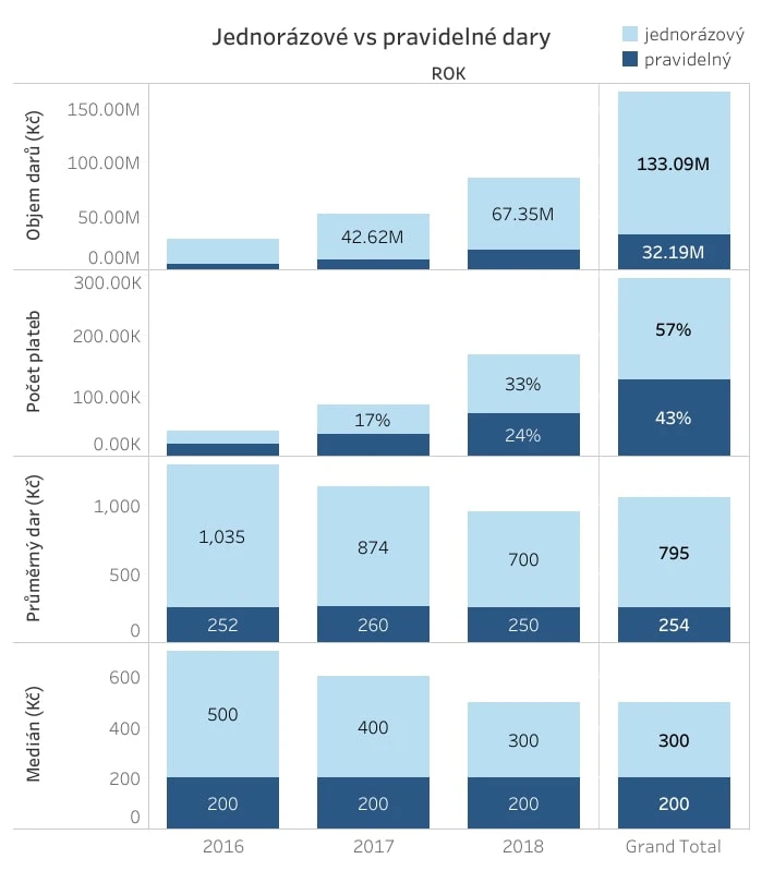 Když k těmto zjištěním přidáme četnost daru, vidíme, že jednorázové dary jsou v průměru 3 krát vyšší než pravidelné. To se promítá do celkového podílu, kde jednorázové dary tvoří 80% z celkového objemu darů. Pravidelných darů je tedy sice málo, ale neměli bychom je opomíjet, jelikož z hlediska počtu plateb tvoří 40% a jejich počet se stále navyšuje.
