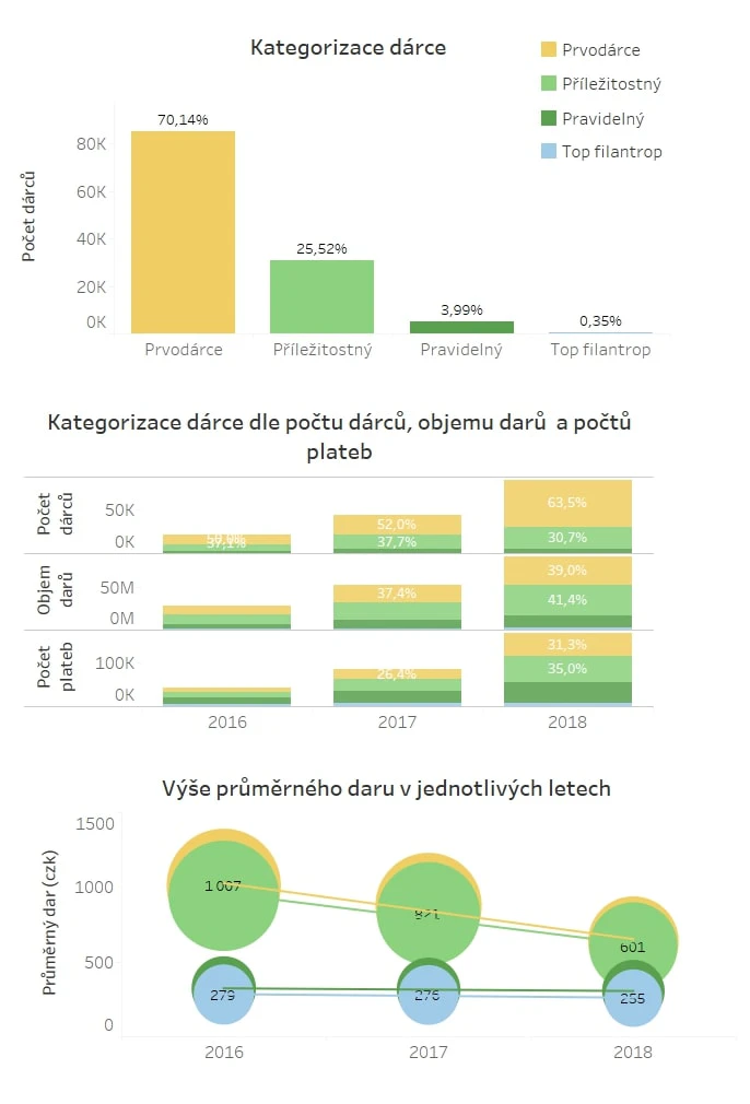 Z následujícího grafu je patrné, že typický dárce spadá do kategorie prvodárce nebo příležitostný dárce a odešle tedy 1–3 platby ročně. Patří sem 95% všech dárců, přičemž obě kategorie se podílejí shodně (40%) na celkovém objemu darů.