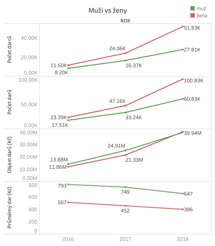 Ženy darují častěji a jsou stále aktivnější, v roce 2018 darovaly dvakrát častěji než muži. Na druhou stranu je jejich průměrný dar zhruba poloviční než dar můžů, a tak se obě pohlaví na celkovém objemu darů podílejí stejně.