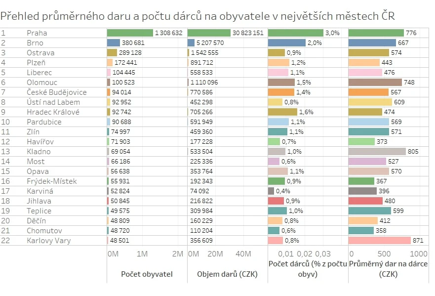 vysoko je i Olomouc, Kladno, Opava či Karlovy Vary. Z větších měst mají nízký dar města z krajů s vyšší nezaměstnaností (Moravskoslezský, Ústecký), ale překvapivě také Plzeň a Liberec. Podíl dárců na celkovém počtu obyvatel (v %) je nejvyšší v Praze, Brně, Olomouci, ale i v Hradci Králové a Českých Budějovicích.