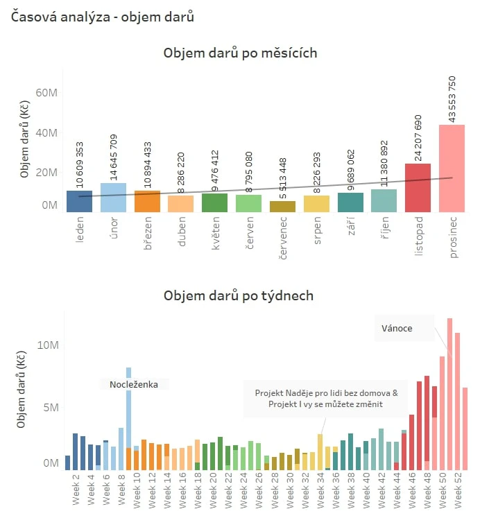 Největší vliv na výsledky časové analýzy měl top projekt Nocleženka, díky které byly z hlediska objemu darů nejsilnější zimní měsíce a nejštědřejší dny 26.–28. únor 2018.