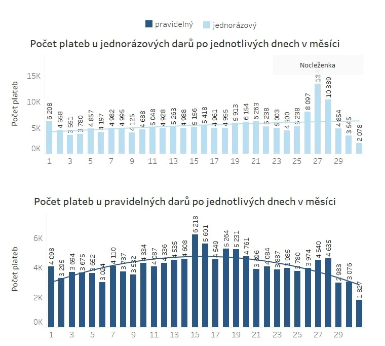 Pravidelný dar je nejčastěji zadán uprostřed měsíce, jednorázový spíše ke konci měsíce. Nejvíce darů bylo odesláno 27. den v měsíci.