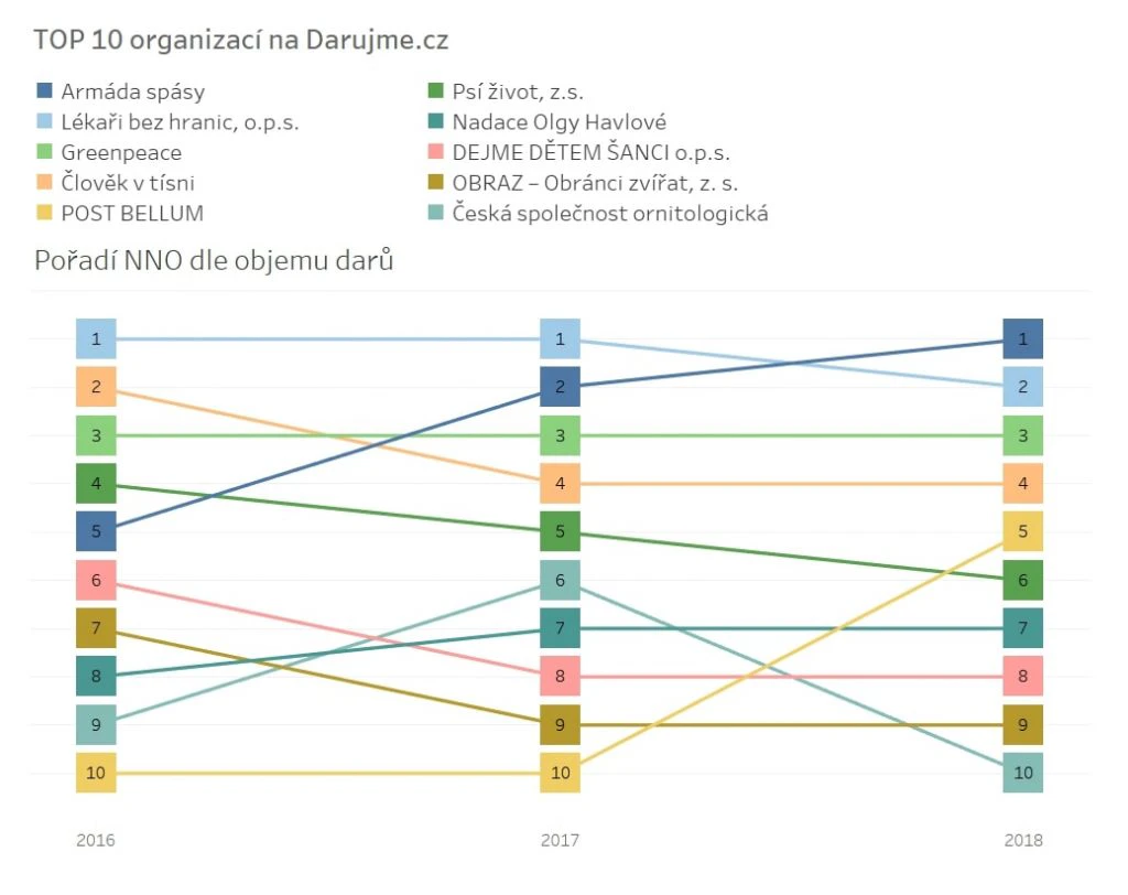 V kategorii top nejvíce rostly organizace Post Bellum a Armáda spásy. Top 9 organizacím připadne 45% celkového objemu darů, mají nejvyšší průměrný počet dárců, ale nejnižší průměrný dar.