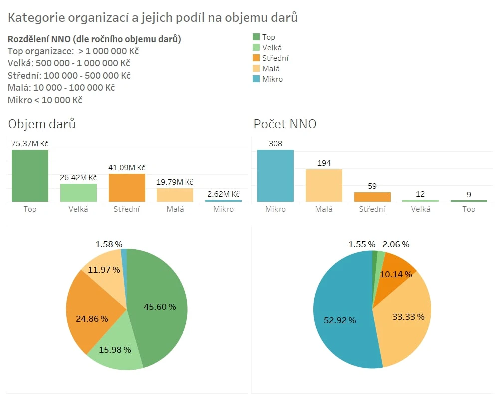 Pro porovnání organizací jsme si vytvořili vlastní kategorie dle objemu darů získaných na Darujme.cz: