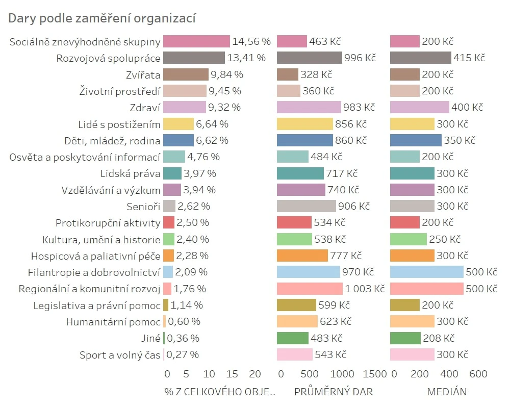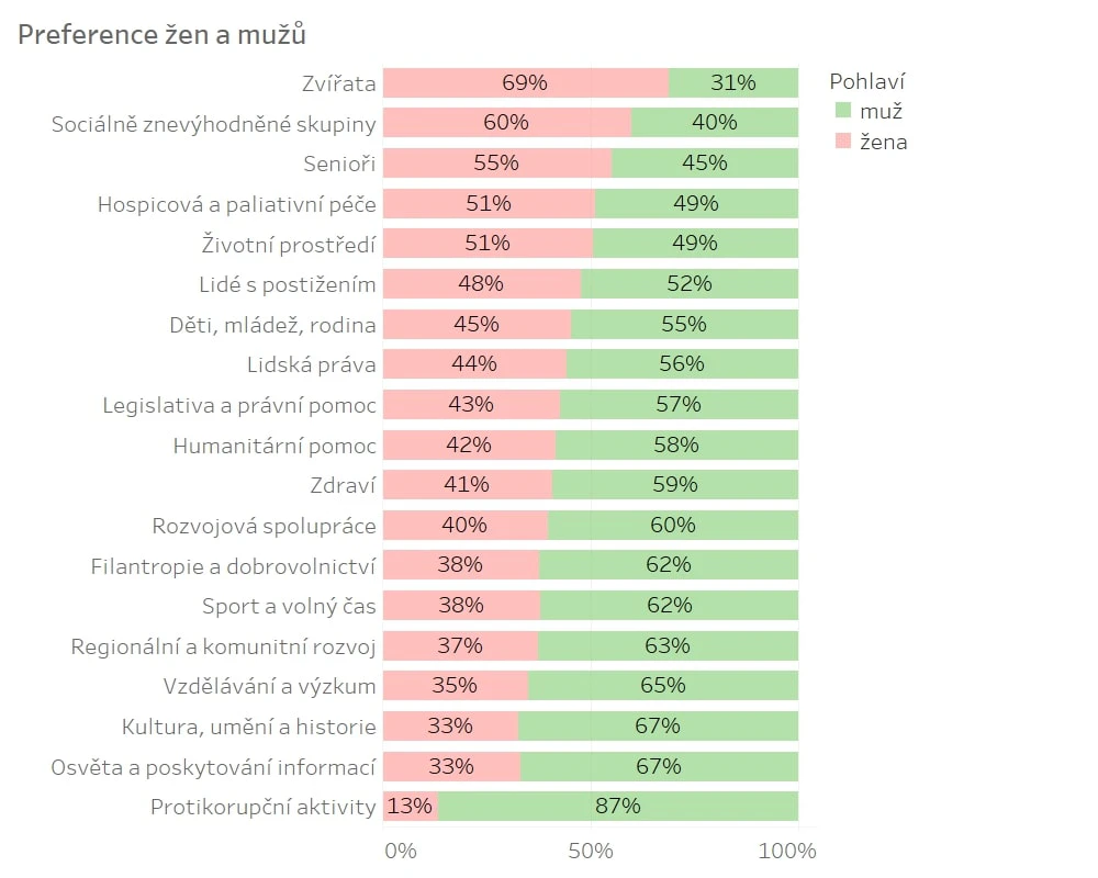 Zajímavé z hlediska zacílení kampaní jsou preference mužů a žen. Ženy častěji přispívají na sociálně znevýhodněné skupiny a zvířata. Naopak muži výrazně dominují v oblastech rozvojová spolupráce, zdraví, vzdělávání a výzkum, osvěta a poskytování informací a protikorupční aktivity. Tomu odpovídá i průměrná darovaná částka (u “mužských oborů” je vyšší).