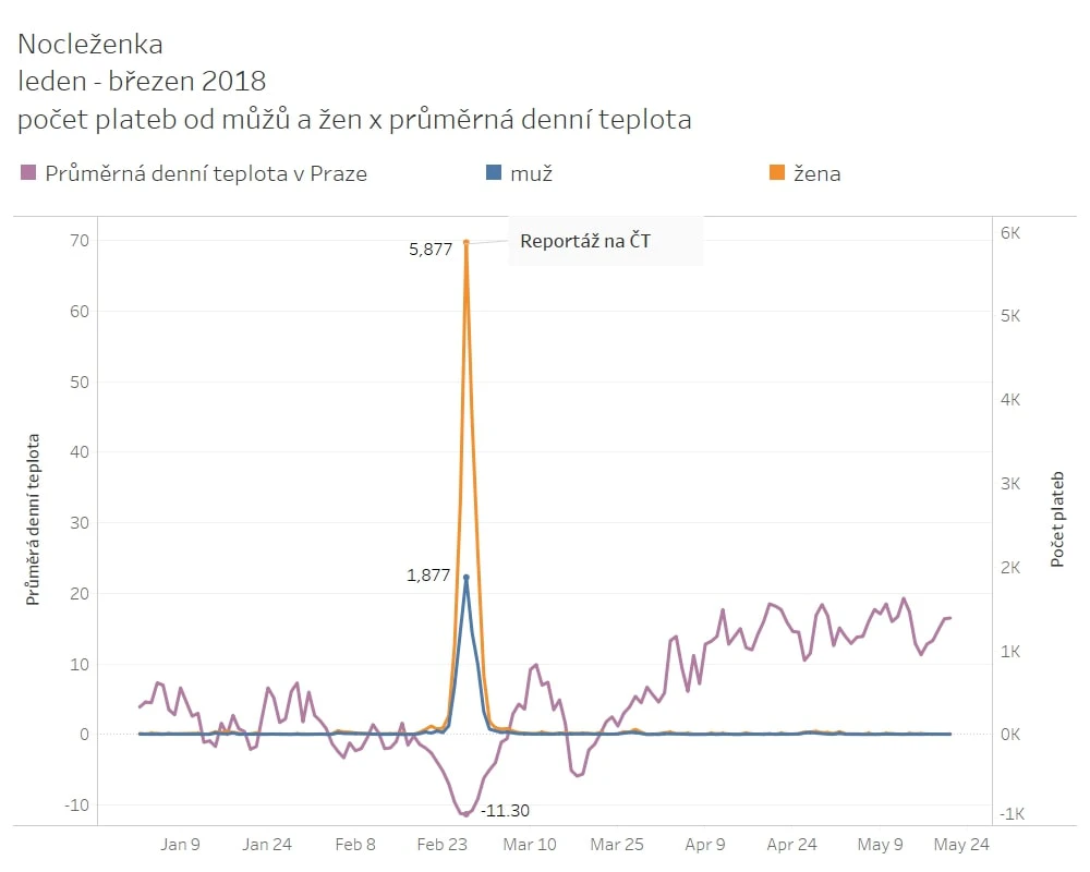 Nejúspěšnějším projektem na Darujme.cz je Nocleženka. V únoru 2018 se jí podařilo načasovat svou kampaň, která se objevila i v reportáži na ČT, na období velkých mrazů, což způsobilo velký nárůst dárců, přičemž ženy na kampaň reagovaly 3x častěji než muži.