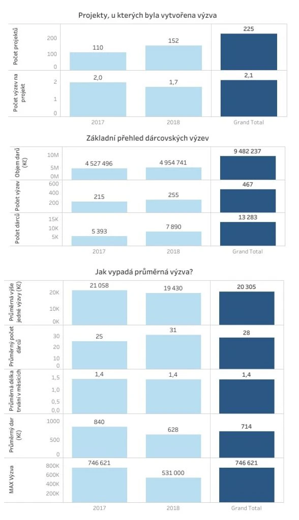 Celkově bylo vypsáno 467 dárcovských výzev k 225 projektům (11% z celkového počtu projektů) a vybráno 9,5 milion Kč (6% z celkového objemu darů). Do výzev se zapojilo celkem 13 tisíc dárců (10% z celkového počtu dárců). Dárcovské výzvy zatím představují menší část z celkového objemu darů, ale jejich počet se neustále zvyšuje (19% růst mezi roky 2017 a 2018).