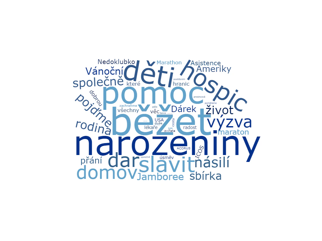 Na základě analýzy nejčastějších slov v názvech výzev jsme zjistily, že nejoblíbenější jsou výzvy běžecké (146 x běhat, 19 x strollering — běh s kočárkem, 20 x marathon) a narozeninové (98 x narozeniny, 50 x slavit). Výzvy jsou většinou cíleny na děti (75x), hospice (53x), domovy (32x), rodinu (15x) a proti násilí (17x).