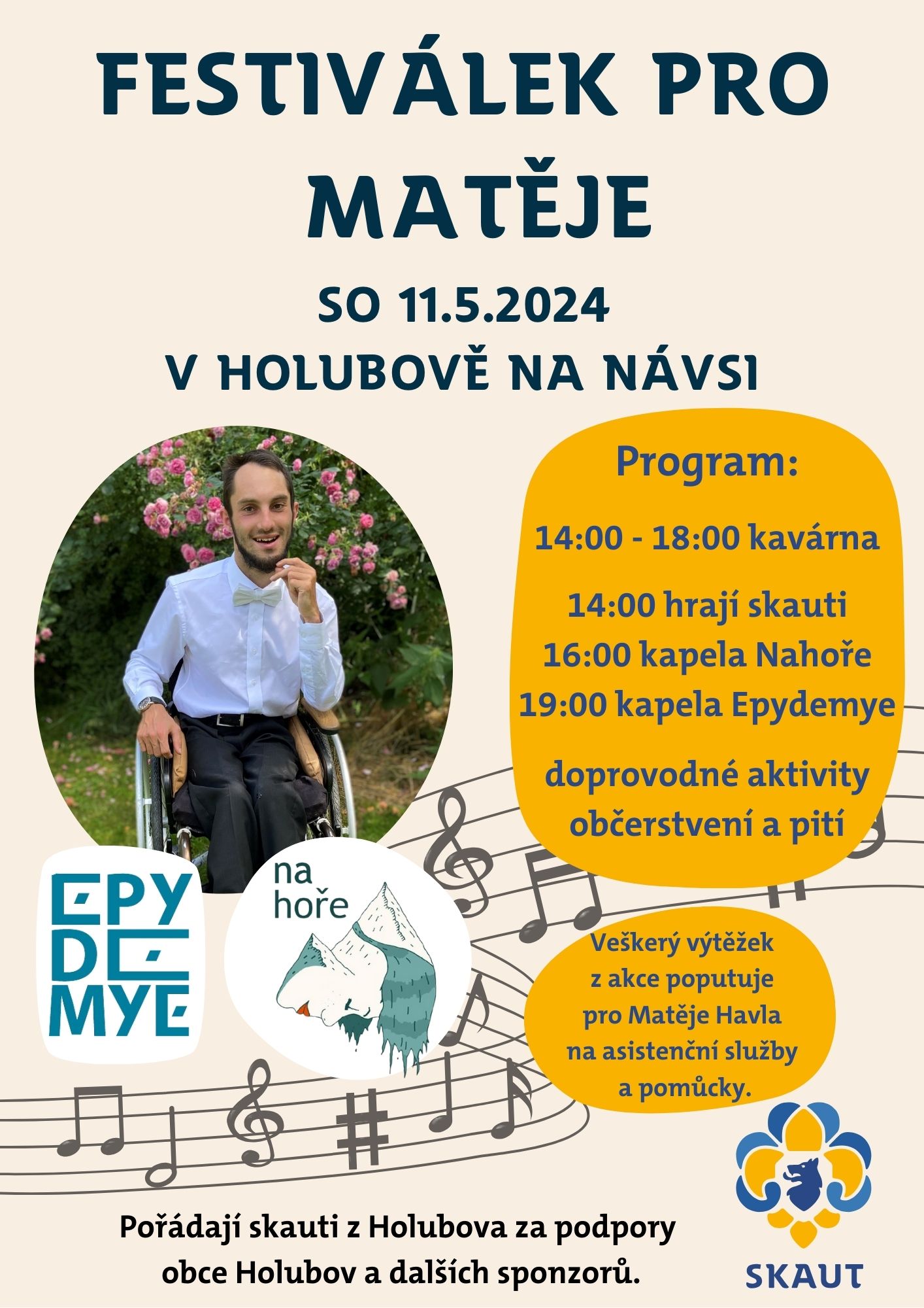 Skauti z Holubova pořádají hudební festiválek, aby podpořili svého spoluobčana Matěje Havla a přispěli mu na asistenční služby a pomůcky. Přijďte si v sobotu 11. 5. 2024 na holubovské návsi užít příjemné odpoledne a přispět Matějovi. Budeme rádi, když Matěje finančně podpoříte!
