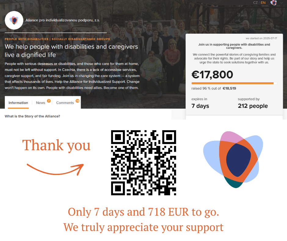 We're moving forward! We now have nearly 80 contributors with a total amount of almost 7000 EUR. Thank you for your support. What’s happened in the meantime? The Alliance for Individualized Support was featured in the main news broadcast on Czech Television!