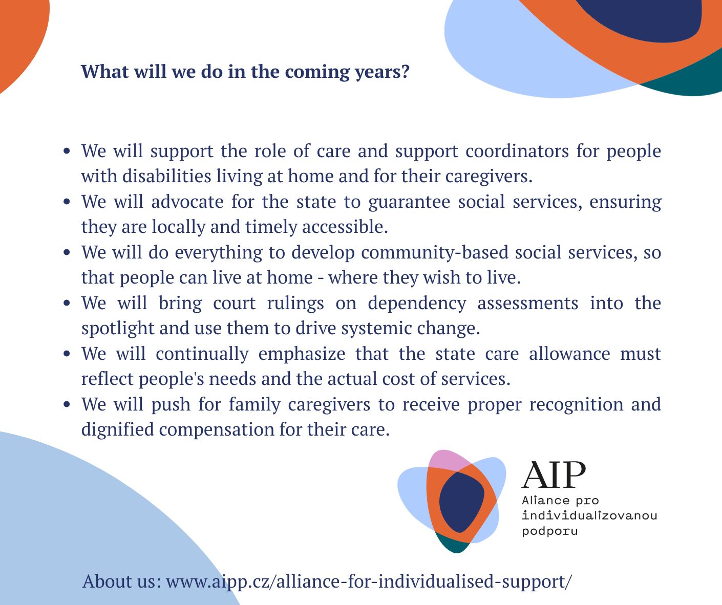 At the June conference Individualized Support 2025, we discussed this in a panel featuring Iva Merhautová (Ministry of Labour and Social Affairs), Jakub Novák (Ministry of Finance of the Czech Republic), Hana Geissler (AIP), Alena Jančíková (Czech Association of Paraplegics - CZEPA), informal caregiver Lucie Ovsenáková, and others.