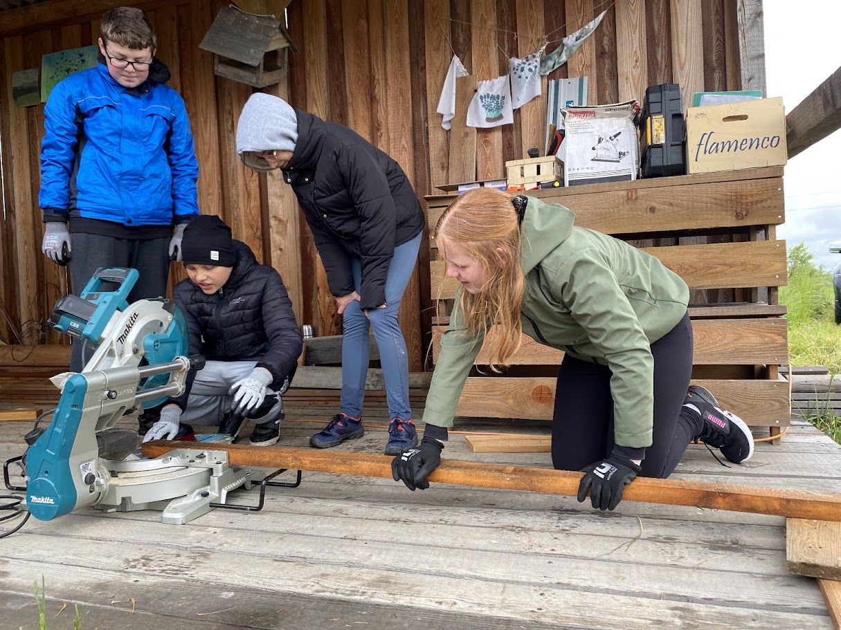 Projektové dny s názvem Pozemky a dílny pro 21. století obnášejí práce se dřevem, s nářadím, péčí o pozemek, o keře a bylinky. A děti moc baví!