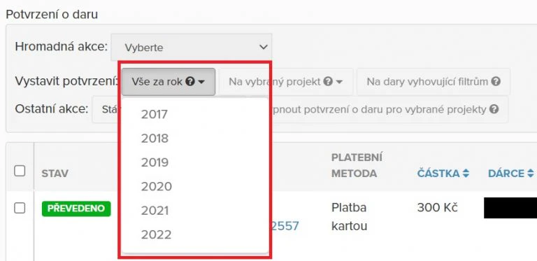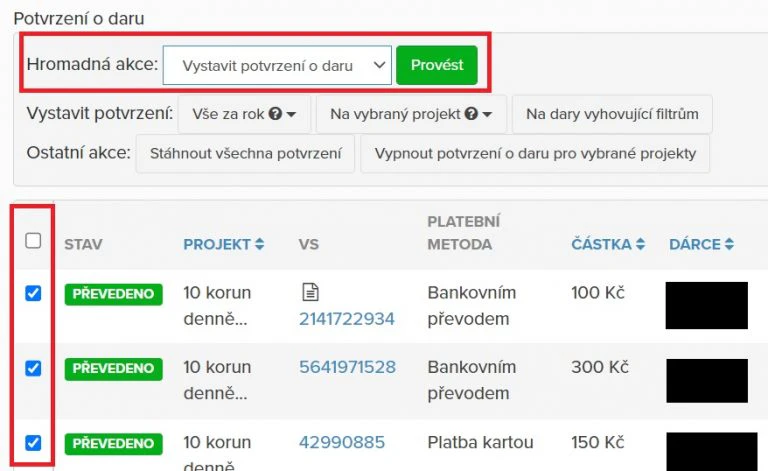 Chci vystavit potvrzení pro konkrétní dary – zaškrtněte checkbox v levé části seznamu darů. Z rozbalovacího menu s názvem Hromadná akce vyberte Vystavit potvrzení o daru a klikněte na tlačítko Provést.