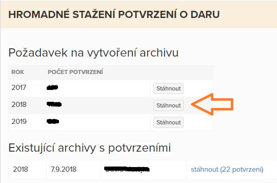 Stáhnout archiv se všemi potvrzeními můžete v záložce Dary v sekci Potvrzení o daru (nad seznamem darů) tlačítkem Stáhnout všechna potvrzení. Poté vyberete příslušný rok a kliknete na Stáhnout. Jakmile se archiv vygeneruje, systém vám pošle e-mail. Stažení vygenerovaného archivu se provádí na stejném místě v sekci Existující archivy s potvrzeními, která se objeví, až si svůj první archiv vygenerujete.