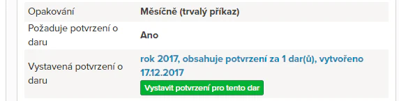 Na detailu daru budete mít možnost si vystavené potvrzení stáhnout. Nebo případně vystavit a zaslat dárci znovu skrze systém.