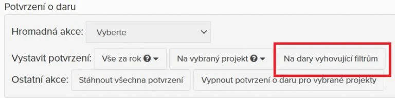 Chci vystavit potvrzení pro vyfiltrované dary – zvolte požadované filtry, klikněte na tlačítko Na dary vyhovující filtrům.