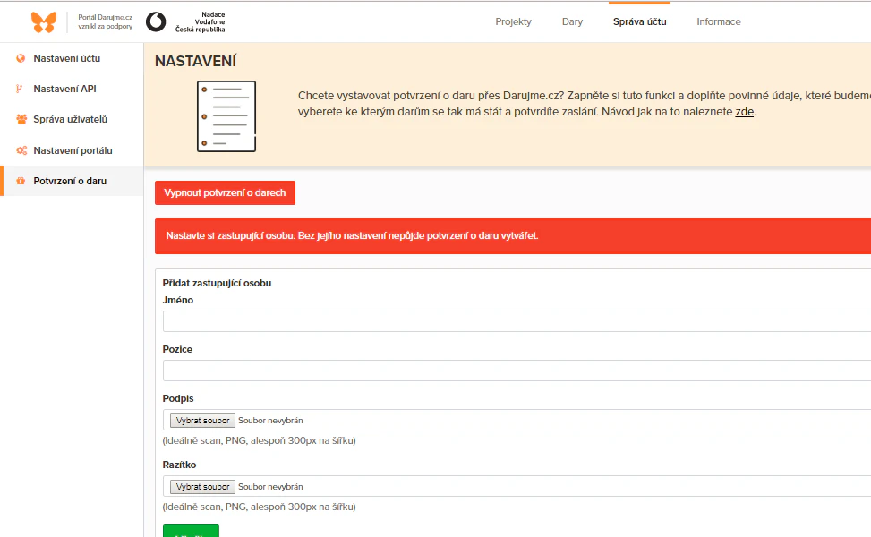 Následně si doplníte osobu, která je za vás oprávněna potvrzení vystavovat. Nahrajete obrázek podpisu zastupující osoby a razítko vaší organizace, vyplníte jméno a funkci zastupující osoby. Tyto údaje se do potvrzení budou automaticky propisovat. V případě, že se změní osoba oprávněná vystavovat potvrzení o daru, přidáte si osobu další a nastavíte ji jako aktuální. Tím se do potvrzení automaticky začne propisovat osoba nová.