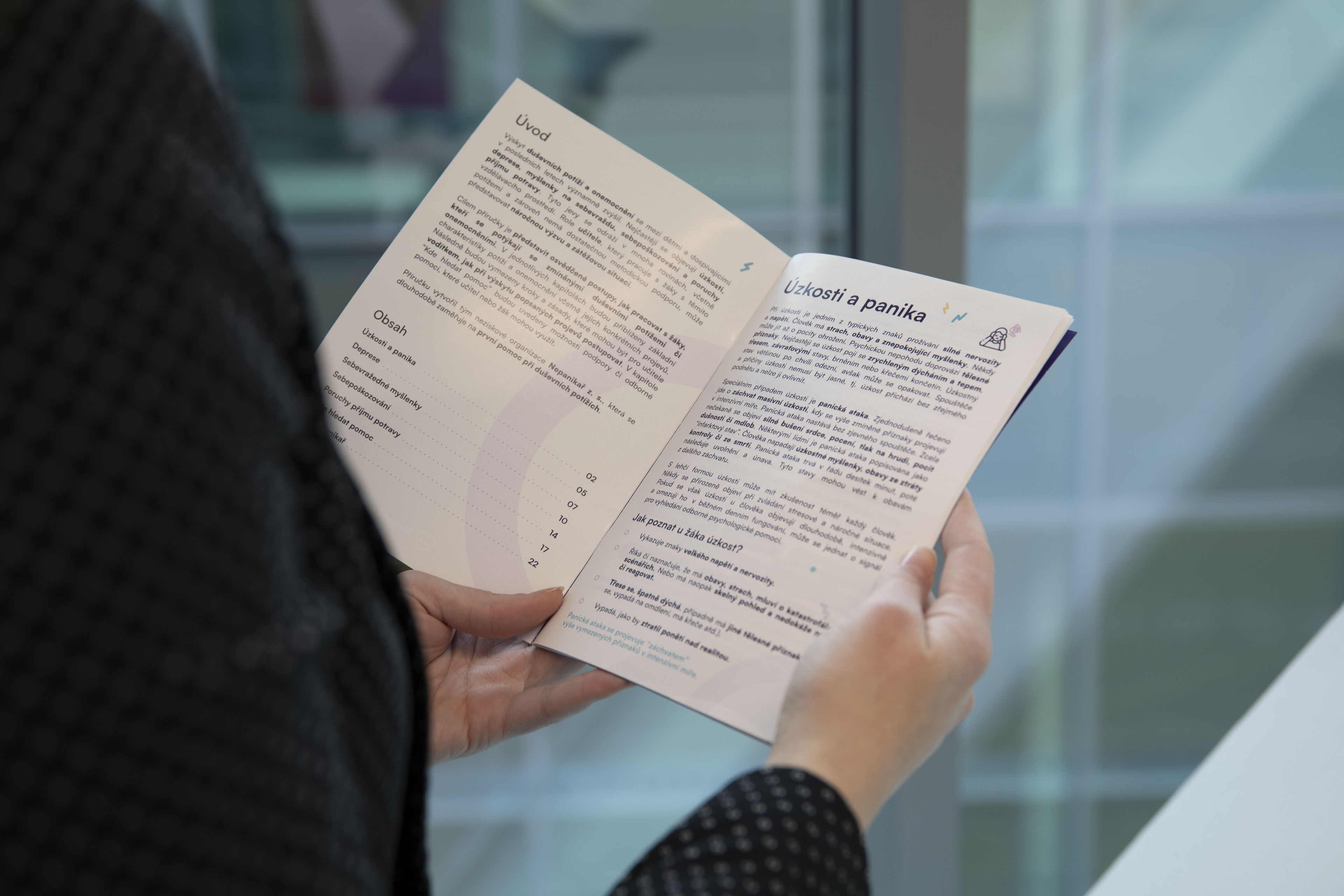 Z těchto důvodu jsme v Nepanikař sestavili příručku pro učitele s osvědčenými postupy, jak pracovat s žáky, kteří se potýkají se zmíněnými duševními potížemi či onemocněními. V příručce jsou přiblíženy základní charakteristiky potíží a onemocnění včetně jejich konkrétních projevů a signálů, podle kterých je učitel/ka může poznat. Příručka také poskytuje kroky a zásady, jak žákovi nabídnout pomocnou ruku. V neposlední řadě zahrnuje možnosti podpory a odborné pomoci, které učitel nebo žák mohou využít.
