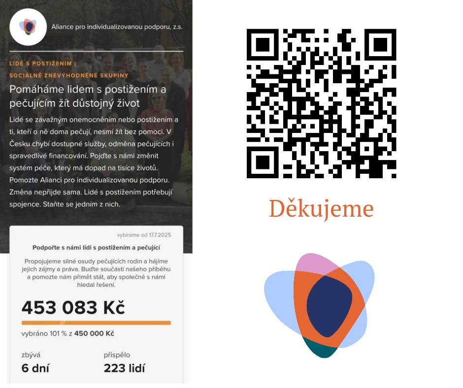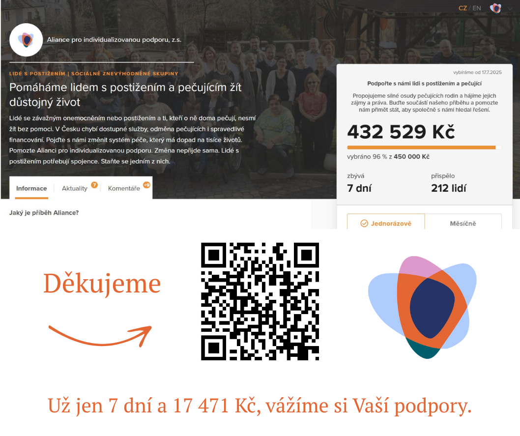 Jedeme dál! Máme bezmála 80 přispěvatelů s částkou 170 000 Kč. Děkujeme za Vaši podporu. Co se mezitím událo? Aliance pro individualizovanou podporu byla v hlavních Událostech České televize!