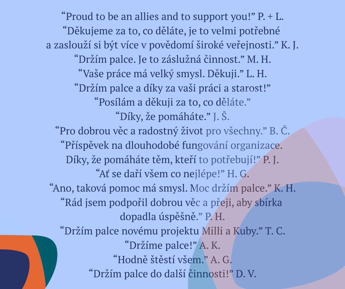 Děkujeme srdečně vám všem, kdo pomáháte s námi. Děkujeme našim sponzorům, partnerům, dárcům a těm, kdo výzvu sdíleli, povzbuzovali a fandili nám. Díky také Milli Janatkové a Kubovi Neubertovi za energii, kterou do kampaně vložili. Máme obrovskou radost a cítíme vděčnost za vaši důvěru na naší cestě. Speciální poděkování patří paní Magdaleně Vildové a panu Tomášovi Drbalovi (BTL).