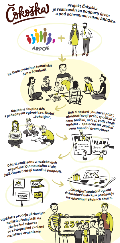Během jednoho školního roku se děti dozvědí, jak se pěstuje kakao, vyrábí čokoláda a rozděluje zisk z jejího prodeje. Dětem je představen koncept spravedlivého obchodování - fair trade. Na zapojené škole vzniká tzv. čokotým, který díky podpoře firem získá fair trade čokolády pro výrobu balíčků a jejich následný prodej na školních akcích. Výtěžek pak děti věnují neziskové organizaci, kterou si sami předem vyberou. Čokoška tak pomáhá zvyšovat finanční gramotnost. Dětem navíc umožňuje konat záslužnou činnost ve prospěch někoho jiného. Projekt propojuje tří různorodá prostředí a umožňuje budovat vztahy mezi školami, neziskovými organizacemi a firmami.