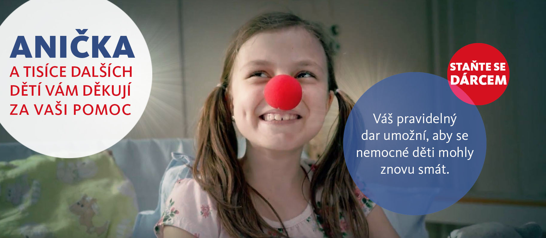 Přineste dětem radost, když ji nejvíc potřebují. S pobytem v nemocnici si všichni spojujeme bolest, strach a smutné prázdno. Ale vy to můžete změnit. Váš dar rozesměje a potěší tisíce dětí v nemocnicích po celé zemi. Jde sem vložit ještě nějakou větu o tom, že pomáháme i seniorům? Aby byla zvlášť věta o dětech a zvlášť o seniorech. Kouzlem červeného nosu. Protože jen díky lidem jako vy můžou Zdravotní klauni pomáhat. Pomáhat smíchuplně. Děkujeme za každý dětský úsměv.