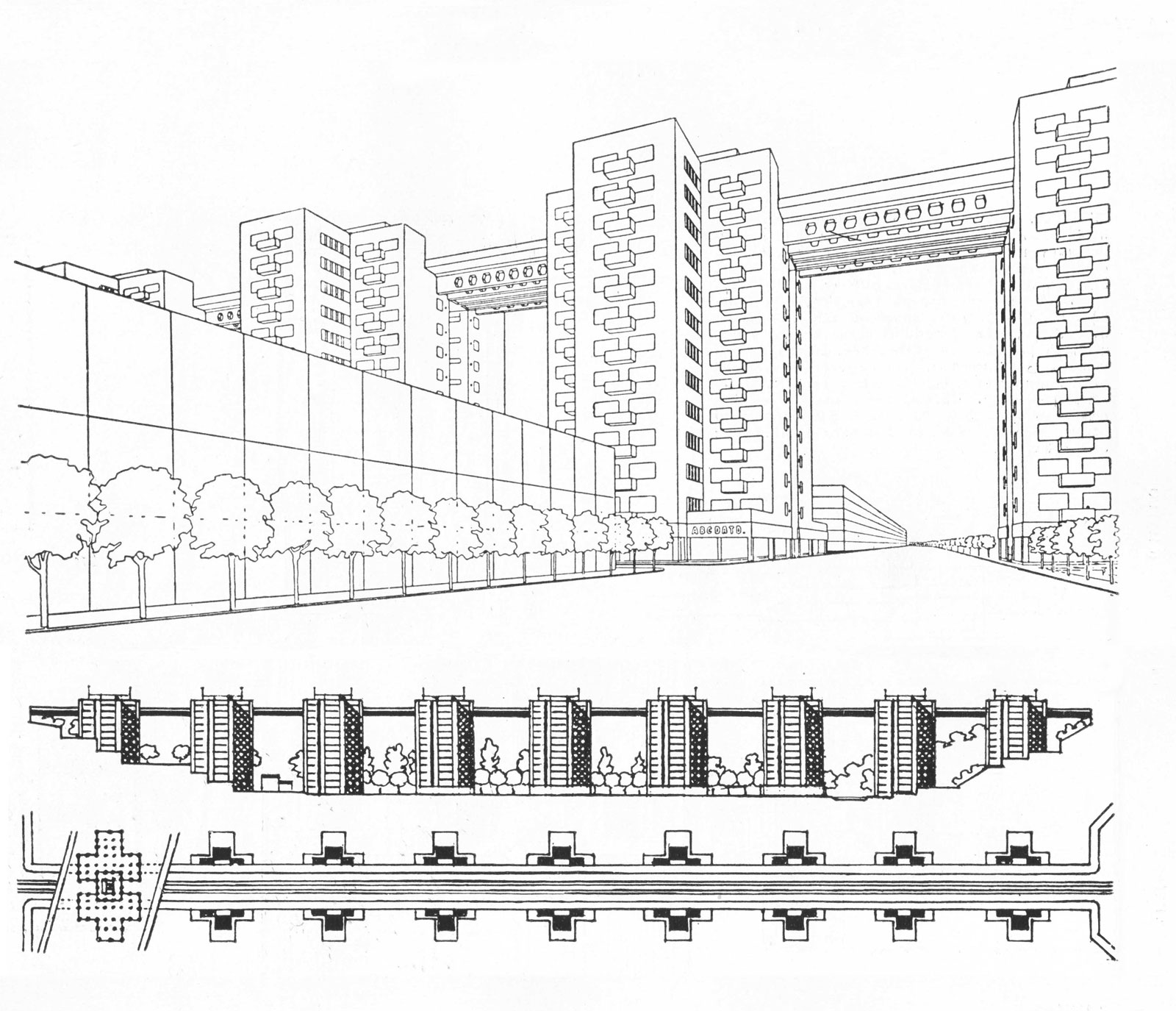 Nerealizovaný Havlíčkův návrh na přemostění Nuselského údolí, mostovku podle jeho odvážné vize měly nést obytné věže.