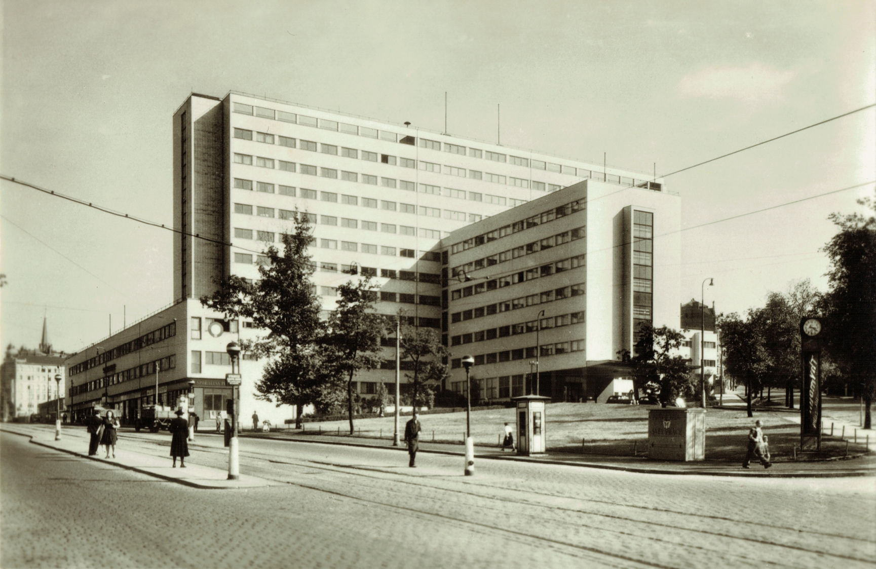 Budova Všeobecného penzijního ústavu (pozdější Dům odborových svazů), tzv. první pražský mrakodrap, který navrhl Josef Havlíček společně s Karlem Honzíkem.