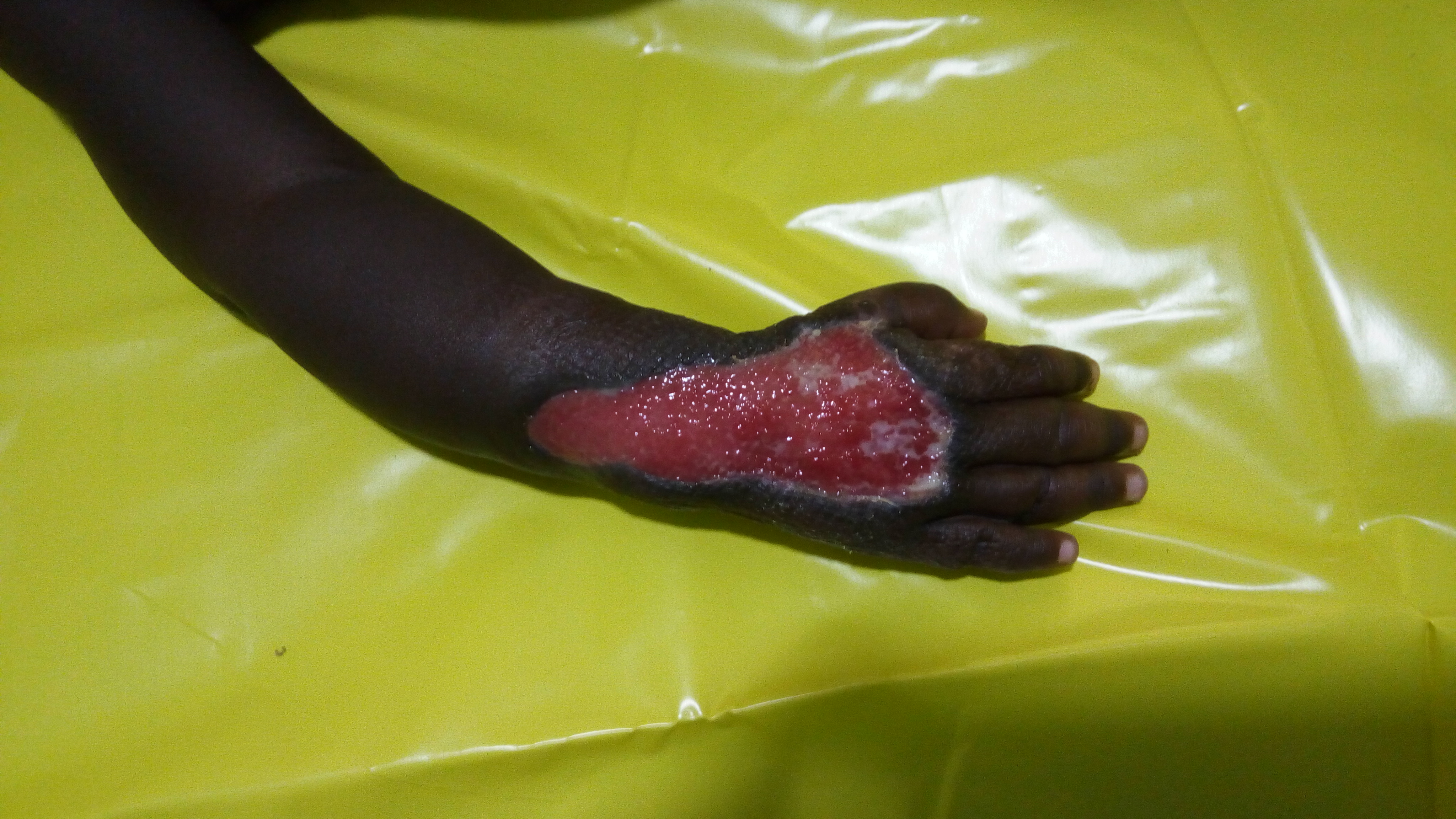 Tato rána vznikla z IV kanyly, která byla špatně zavedena v jiné klinice. Chlapeček ztratil chemickými popáleninami z léků kůži na celém dorzu ruky a kůži potřebuje odtransplantovat.🔥😷💉