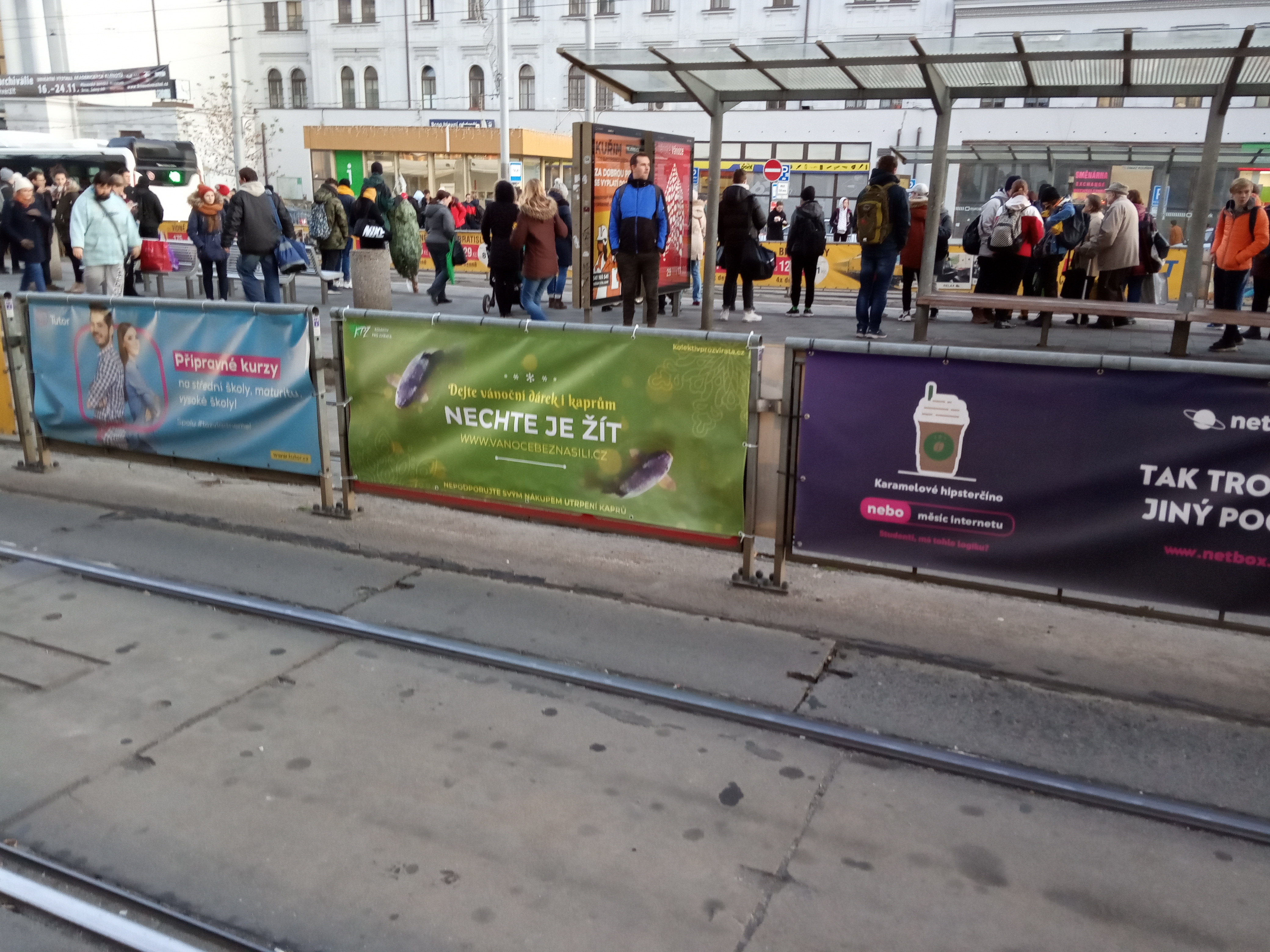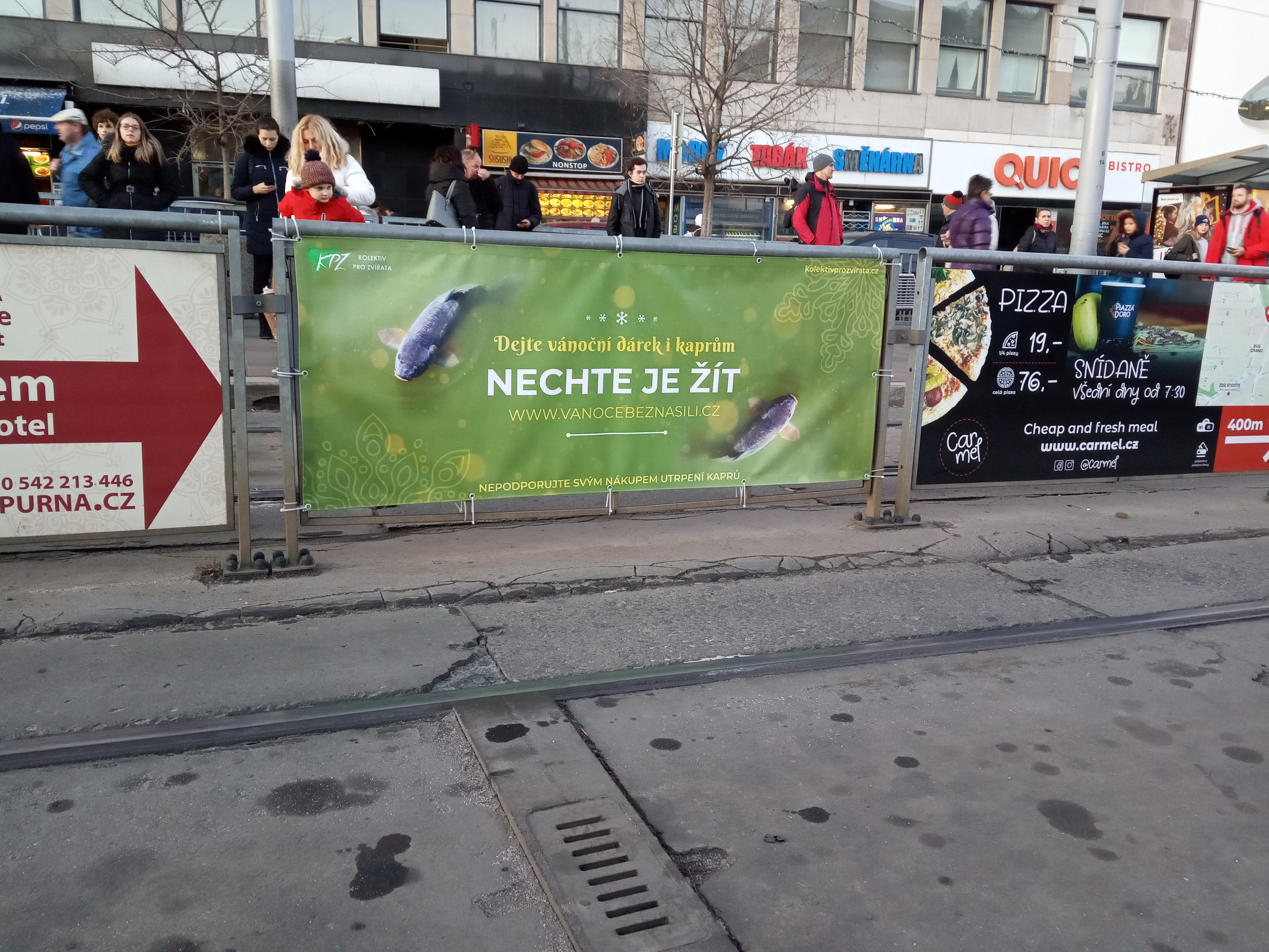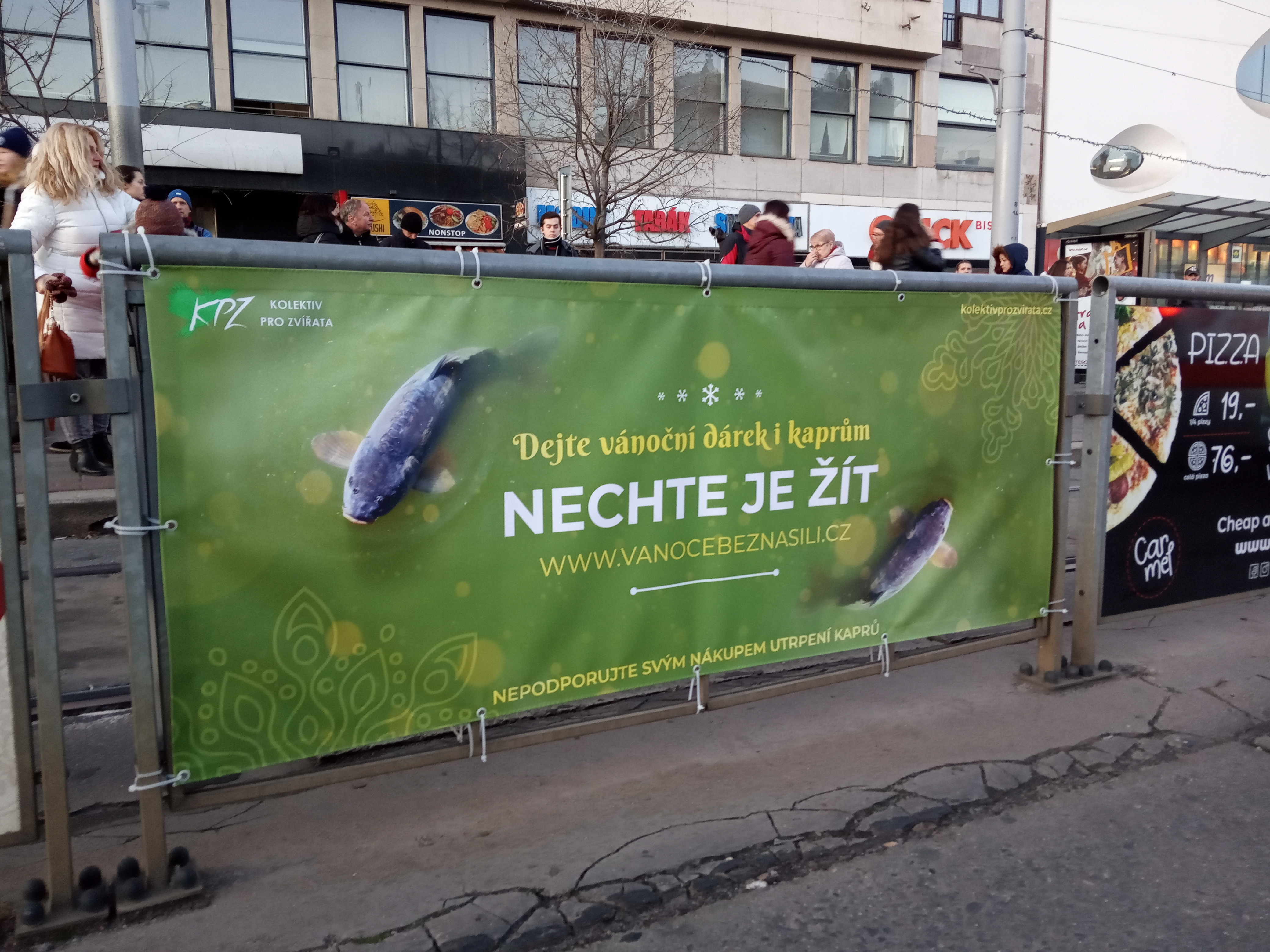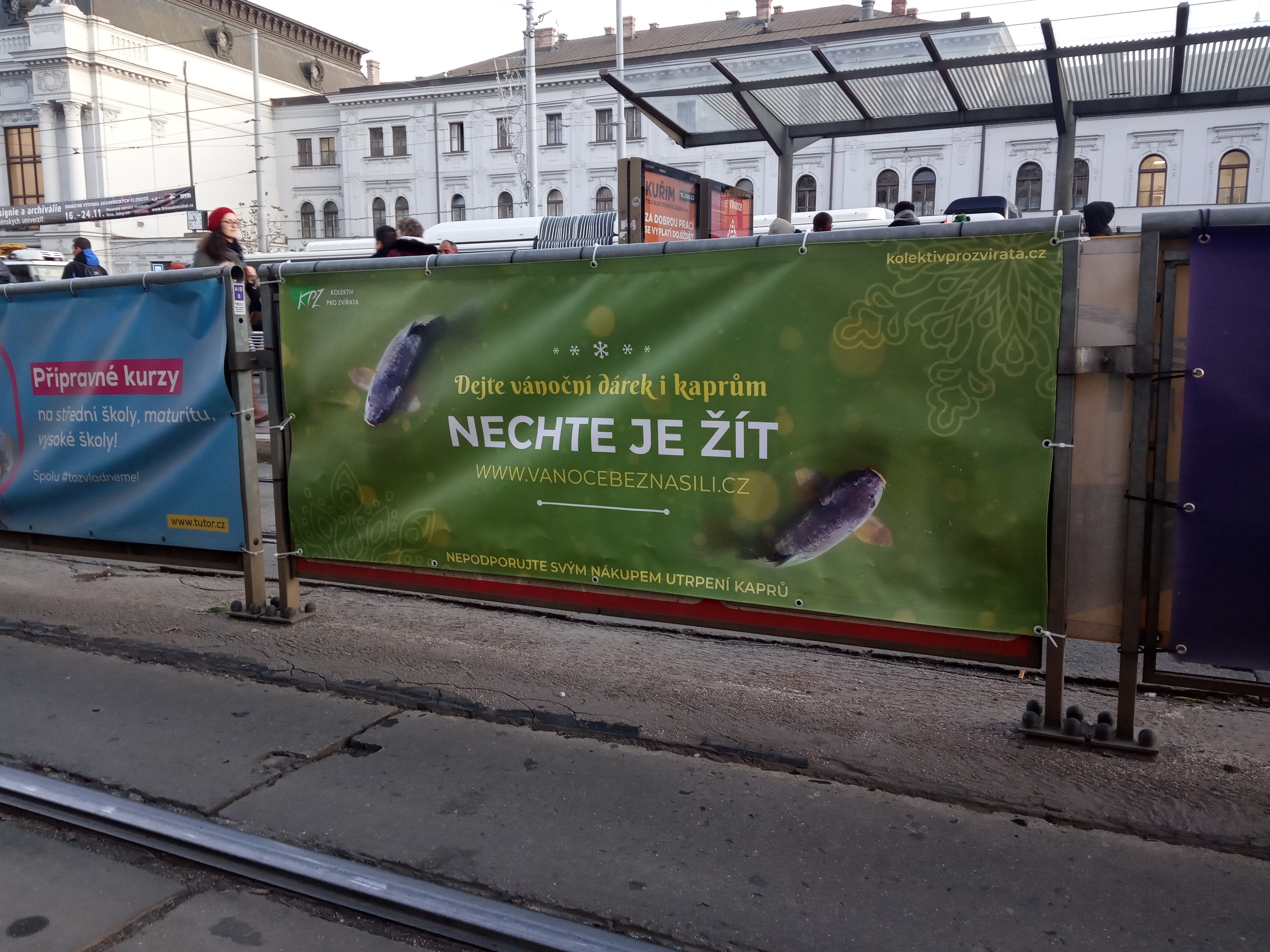 Za Kolektiv pro zvířata z.s. jsme se v rámci projektu Vánoce bez násilí rozhodli umístit dva reklamní bannery na brněnském Hlavním nádraží. Oba bannery nesou text „Dejte vánoční dárek i kaprům, nechte je žít“. Pro racionálnější povahy je na banneru dále napsáno „Nepodporujte svými nákupy utrpení kaprů“. Bannery kolemjdoucí přivedou na web www.vanocebeznasili.cz, který obsahuje informace ohledně průmyslového zpracování kaprů, ale také alternativy ukazující, jak si připravit štědrovečerní večeři bez utrpení.